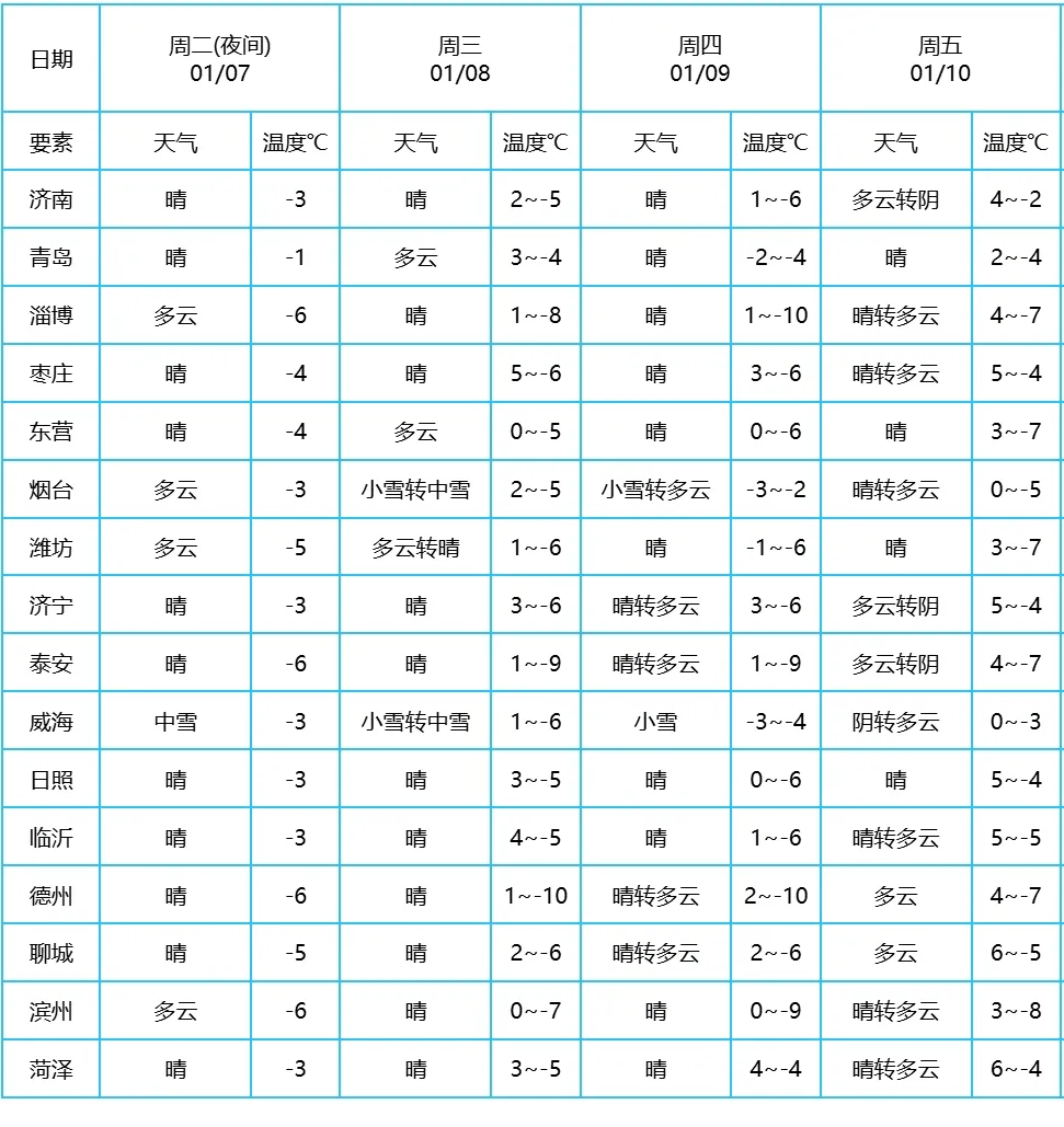 威海天气阴有中雪局部大雪,烟台北部天气阴有小到中雪,青岛北部天气阴局部有小雪,其他地区天气晴到少云。北风,半岛地区4~5级阵风6~7级增强到5~6级阵风7~8级,滨州、东营、潍坊和日照4~5级阵风6~7级减弱到3~4级,其他地区3~4级。最低气温:鲁中山区-8℃左右,沿海地区-3℃左右,其他地区-6℃左右。最高气温:菏泽、济宁、枣庄和聊城3℃左右,鲁中山区和半岛地区-2℃左右,其他地区0℃左右。