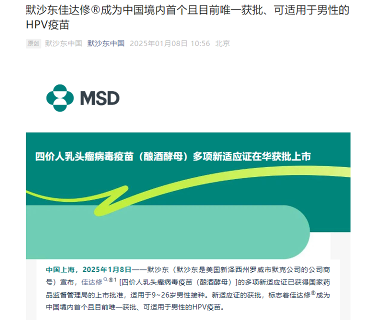 新适应证的获批,标志着佳达修成为中国境内首个且目前唯一获批、可适用于男性的HPV疫苗。