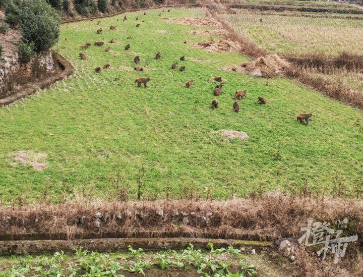 猴群主要觅食的地方,是靠近山边的菜地,没有跑到村里去骚扰人家,它其实挺怕人的。
