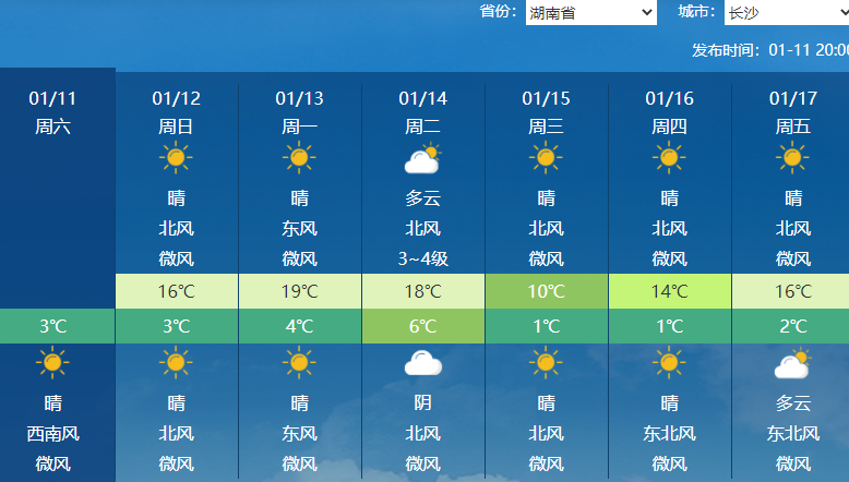南方回暖力度更大!14日前后,黄淮到长江中下游地区一带气温偏高幅度将最为显著,其中湖南中南部、江西、浙江等地不少地方最高气温将达到20℃上下。像武汉、杭州、长沙、南昌最高气温较同期都会偏高8~10℃,本是三九隆冬时节,却暖得像3月惊蛰甚至春分。