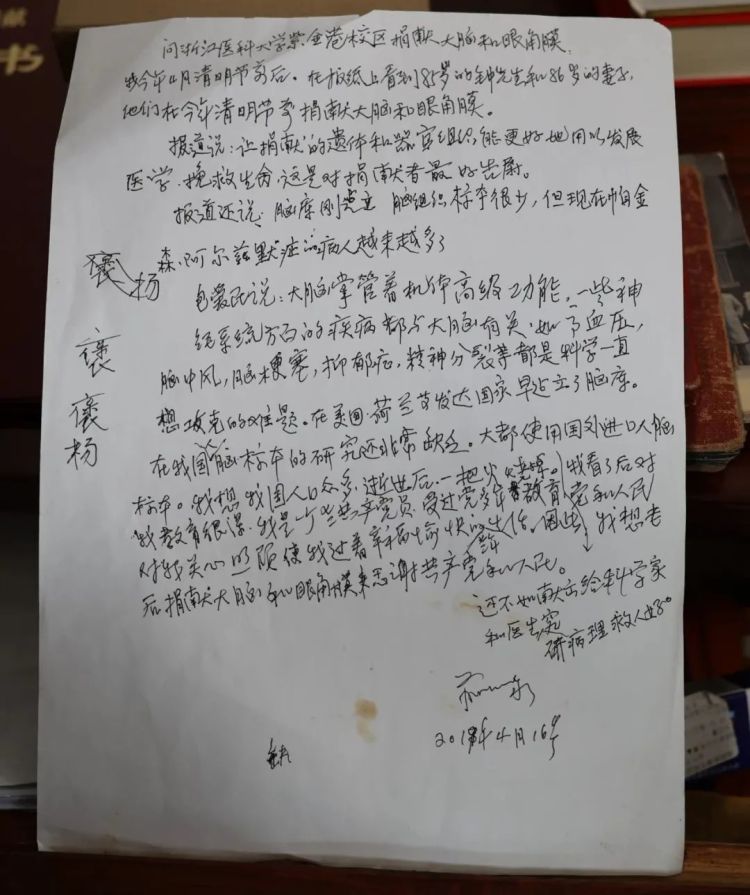 “党和人民对我的关心和照顾,使我过着愉快的老年生活,因此我想只有老后捐献大脑和眼角膜来感谢党和人民。”