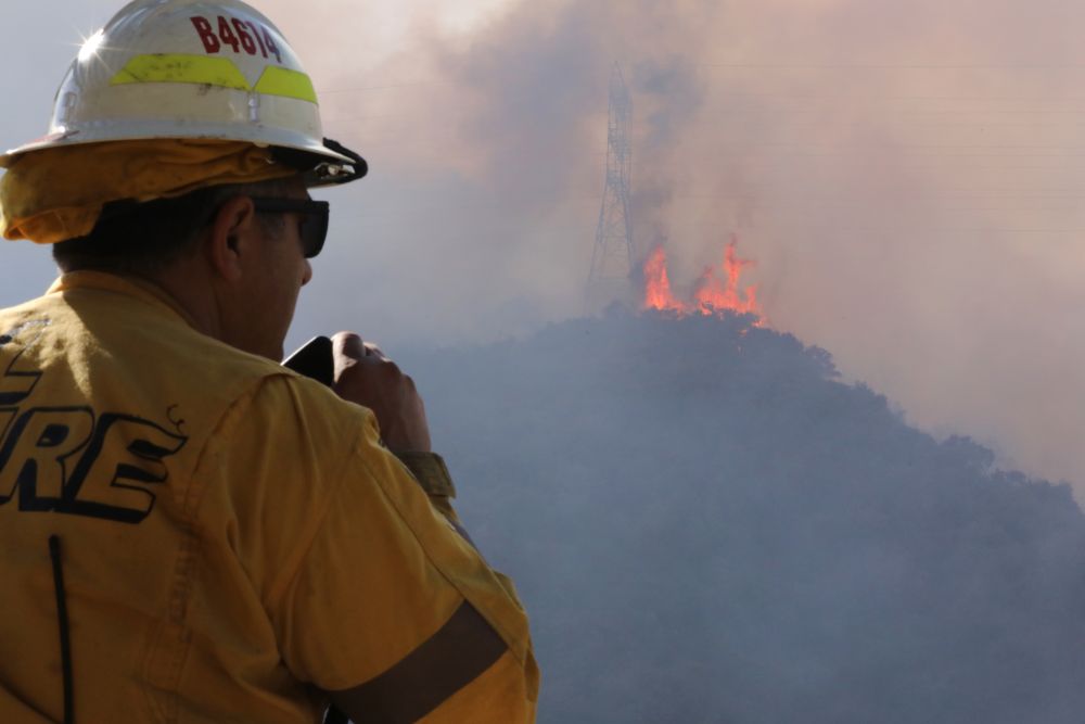 1月11日,消防员在美国加利福尼亚州洛杉矶曼德维尔峡谷的一座山丘顶部观望野火火势。新华社发(邱晨摄)