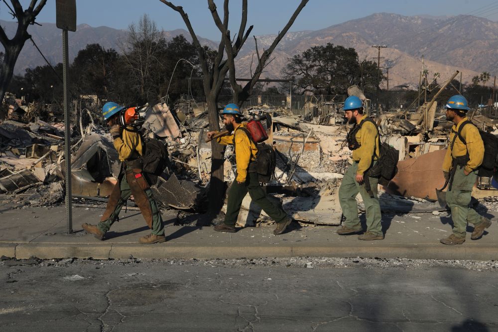 1月10日,在美国加利福尼亚州洛杉矶县阿尔塔迪纳地区,消防员在山火过火区域巡查。新华社发(邱晨摄)