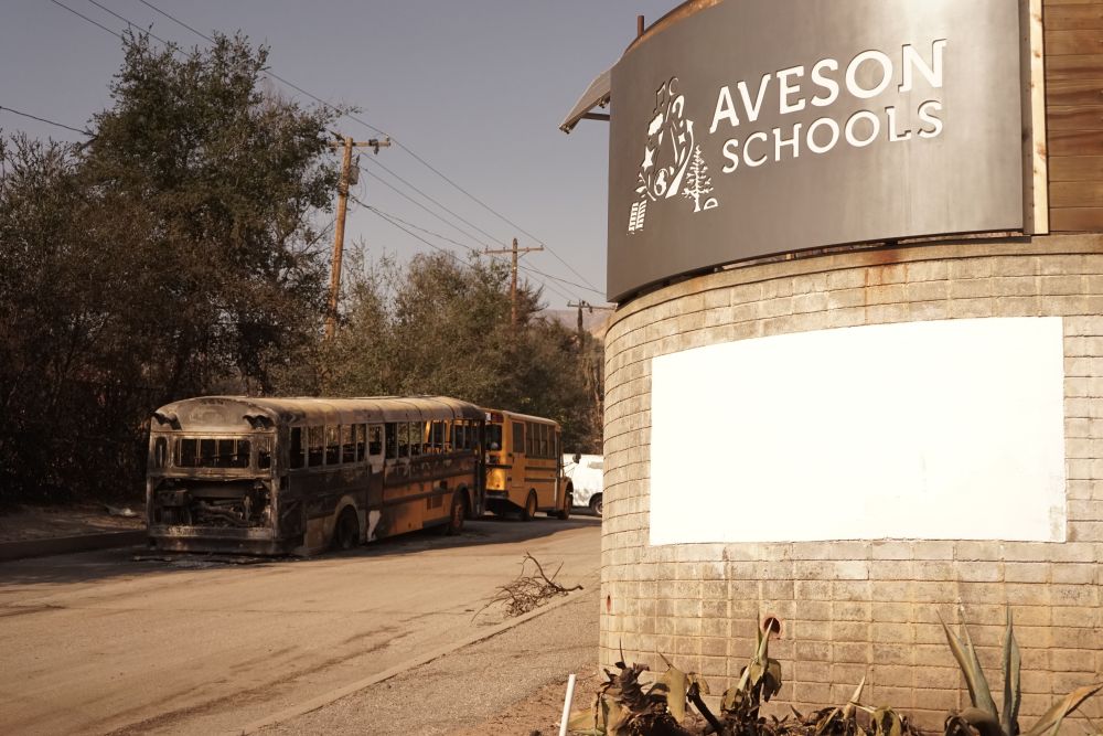 这是1月10日在美国加利福尼亚州洛杉矶县阿尔塔迪纳地区拍摄的遭到山火破坏的校车。新华社发(曾慧摄)