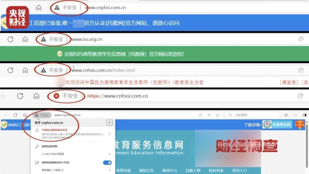 再一一打开,相似的架构布局,一样的顶部装饰,强调“该网站工信部已备案,唯一官方认证”,几乎在网页地址栏都显示有不安全站点链接的警示。