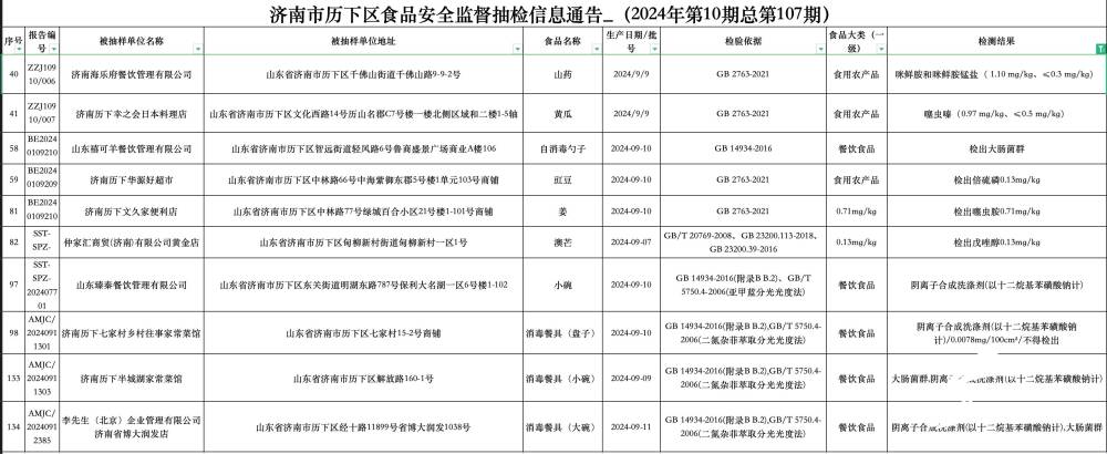 抽查发现,李先生(北京)企业管理有限公司济南省博大润发店、山东臻秦餐饮管理有限公司、山东禧可羊餐饮管理有限公司、济南历下半城湖家常菜馆、济南海乐府餐饮管理有限公司、济南历下幸之会日本料理店、仲家汇商贸(济南)有限公司黄金店、济南历下七家村乡村往事家常菜馆、济南历下华源好超市、济南历下文久家便利店等企业的山药、黄瓜、消毒餐具等被检出不合格。不合格项目主要有检出大肠菌群、阴离子合成洗涤剂(以十二烷基苯磺酸钠计)/0.0078mg/100cm²/不得检出、检出噻虫胺等。