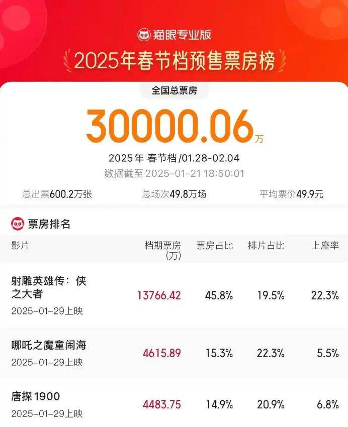 >>>据猫眼专业版数据,21日18时50分,2025年春节档(1月28日-2月4日)预售总票房破3亿元,刷新中国影史春节档预售票房最快破3亿元纪录!《射雕英雄传:侠之大者》持续领跑2025春节档预售票房榜。