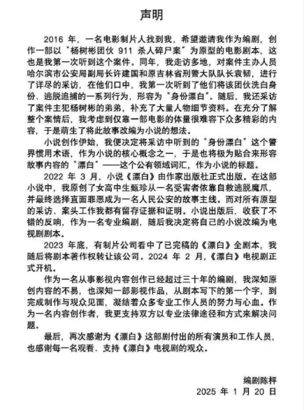 1月21日凌晨,《漂白》编剧陈枰发文回应称,2016年有电影制片邀请她创作一部以“杨树彬团伙911杀人碎尸案”为原型的电影剧本,她随后将此故事改编成小说。该小说的核心概念“漂白”来自案件主办人员的采访中听到的“身份漂白”。“对所有原型的采访、案头工作我都有留存证据和证明……支持双方以专业法律途径和方式来解决问题。”