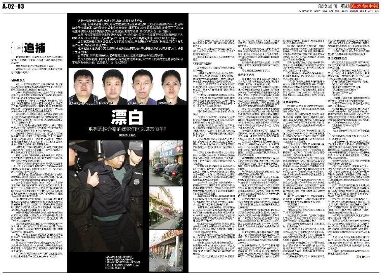 王猛在文中还提到,《漂白》这篇报道的核心事实是,上世纪末,哈尔滨有三男一女结成团伙,流窜东北、长三角和珠三角等地,主要物色夜场多金女,实施哄骗绑架抢劫,然后杀人碎尸灭迹。从1998年到2004年,他们共犯下6起杀人碎尸10人的特大命案,累计获取赃款200多万元。2004年后,他们买通河南和山西等地相关人员改名和改年龄,获取新身份,然后利用新身份,远赴内蒙古包头安家,或新组建家庭、或做生意,平时互不来往,也不与老家联系。2011年,公安部发起“清网行动”,哈尔滨市公安局巡警支队的一名警务人员,发现某A级通缉犯,颇似多年未见的发小,在公安部资料库中多方搜索和比对,这才发现该犯改名及改年龄的事实。经过三个月的缜密侦查,2011年11月,警方在包头成功抓获了潜逃多年的4名逃犯。《漂白》这个标题出自南方都市报原深度部编辑吴倩。虽只有两个字,但非常精辟。