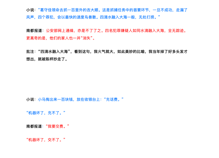 王猛还在文章中列举了17处小说与报道涉嫌抄袭和引用部分的对比。