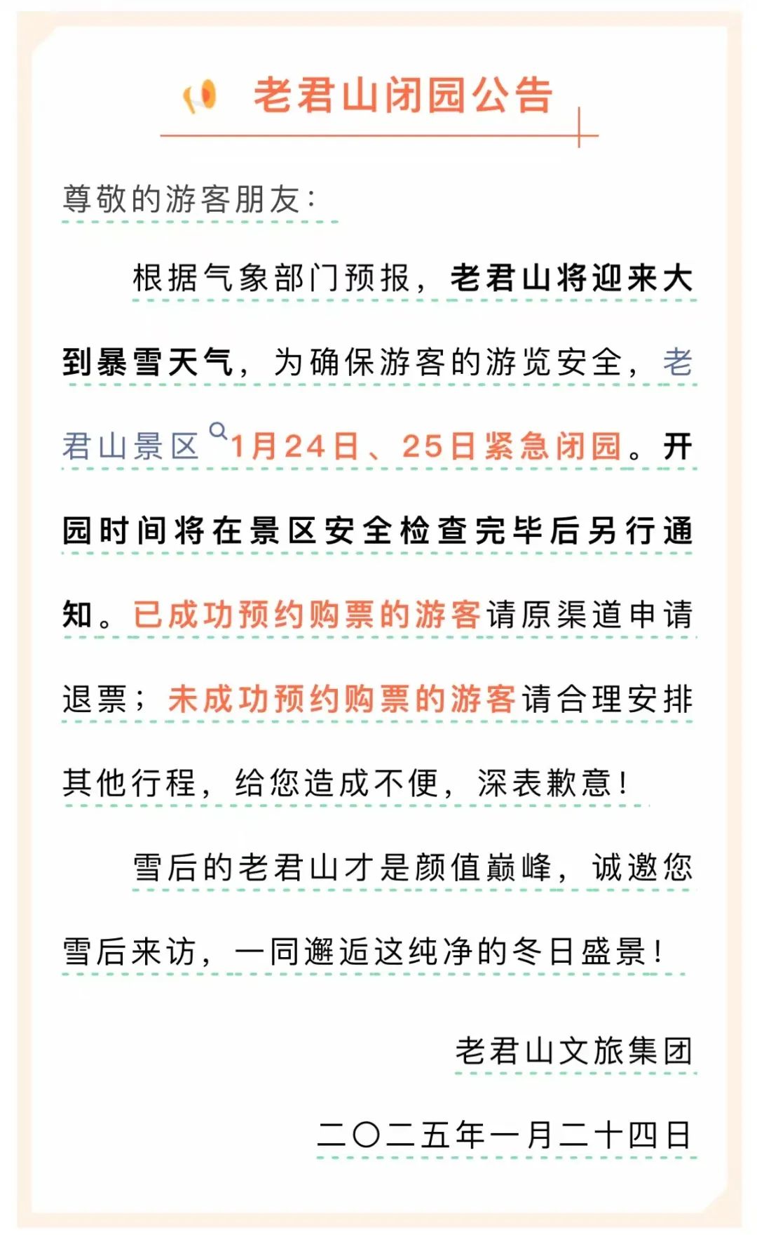 1月24日,“老君山风景名胜区”公众号发布《老君山景区1月24日、25日紧急闭园公告》:根据气象部门预报,老君山将迎来大到暴雪天气,为确保游客的游览安全,老君山景区1月24日、25日紧急闭园。