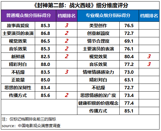 从细分维度来看,在普通观众评价中,《封神第二部:战火西岐》主要演员的表演、视觉效果、音乐效果、新鲜感和传播方式得分居档期第二位,故事喜爱度、不枯燥指标得分居第三位;在专业观众评价中,影片的视觉效果、音乐效果得分居档期第三位。