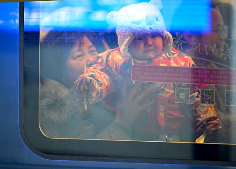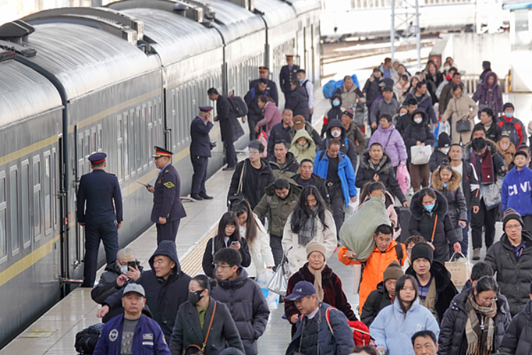 2025年2月3日,旅客在山东烟台站下车出站。图据视觉中国