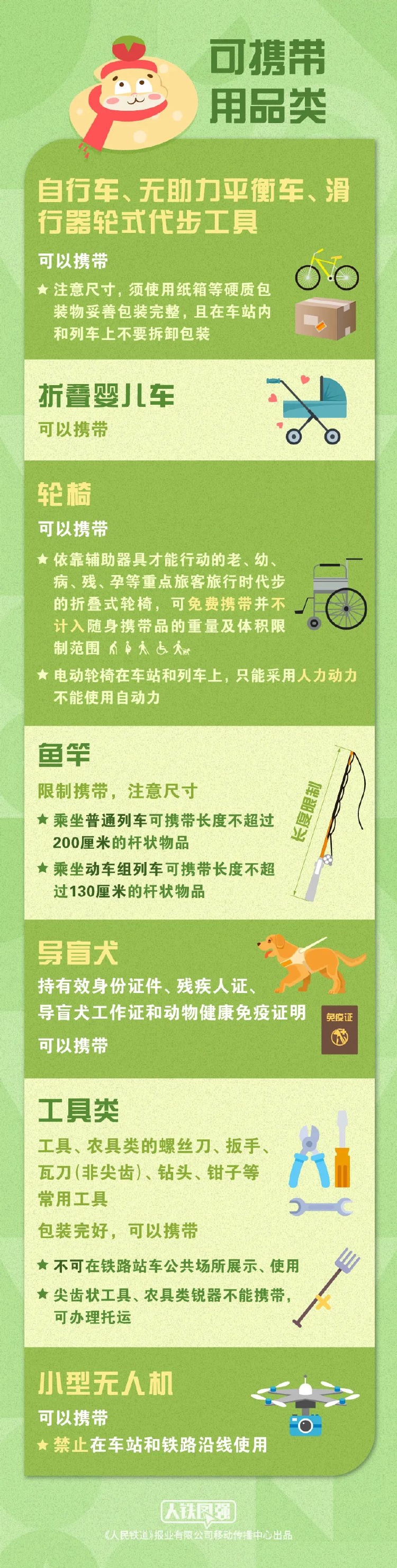自行车、折叠婴儿车、轮椅等代步工具可以携带。除了视力障碍旅客携带的导盲犬,任何活体动物,不论体型大小,都不能带进车厢。