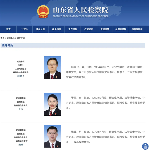 近日,山东省人民检察院网站“领导介绍”栏目更新信息显示,于玉、鲍峰已担任山东省人民检察院党组副书记、副检察长、检察委员会委员。