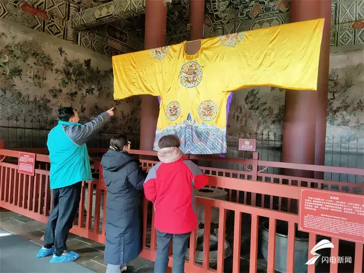 齐鲁网·闪电新闻2月11日讯 近日,在泰安岱庙天贶殿内,一件承载着深厚历史底蕴与超凡精湛技艺的1:1复刻“龙袍”展出,吸引游客纷纷驻足。此“龙袍”身长2.2米、通肩4.4米,十团龙绣纹栩栩如生、形态各异,最长的一条龙长至58厘米,其领围大至1.3米。
