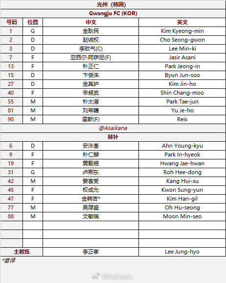 光州FC替补:31-卢熙东、6-安泳奎、42-姜喜受、77-吴厚盛、88-文敏瑞、9-朴仁赫、19-黄载桓、45-权成允、45-金韩吉