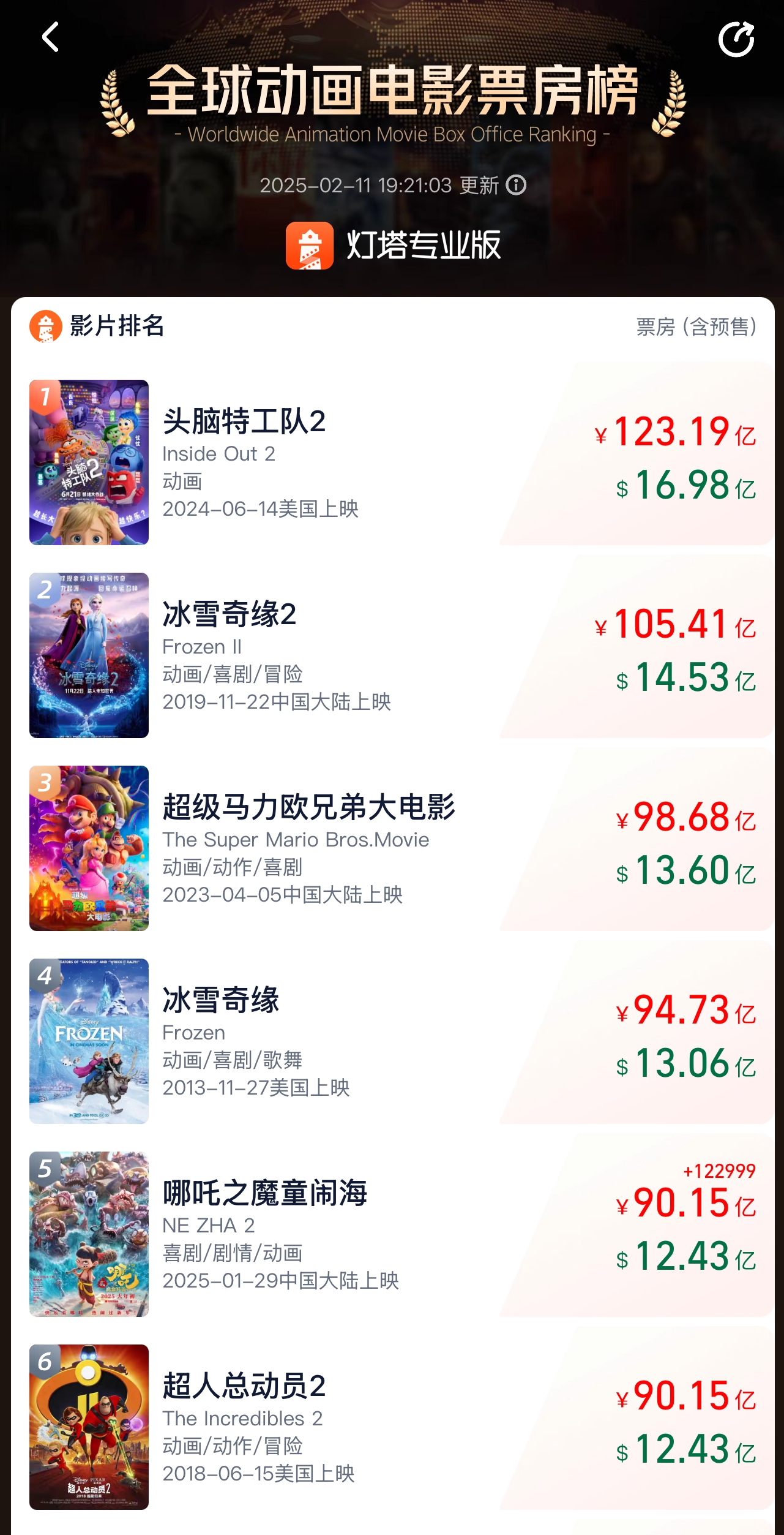 《哪吒之魔童闹海》进入全球动画电影票房榜前五