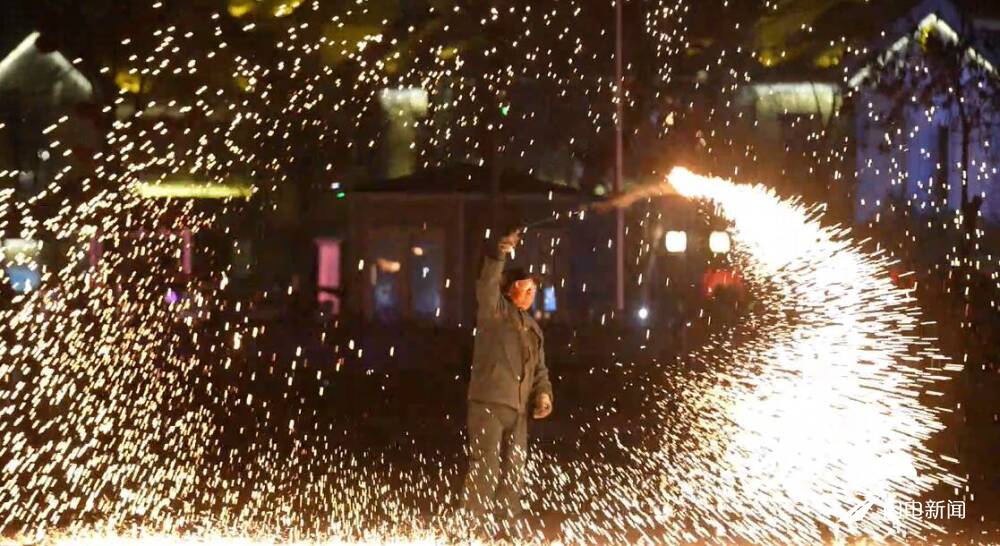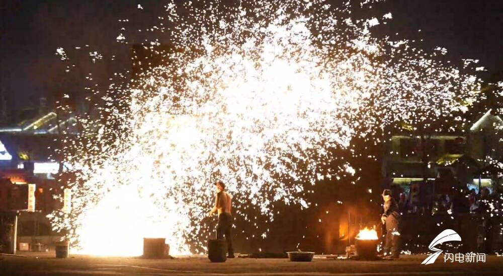 期间,在火壶表演的余韵中,“打铁花”又接踵而至。伴随着激动人心的音乐声响起,表演者们手持铁勺,用力抛洒向天铁水。刹那间,金色的铁花如金雨般在空中盘旋,最终缓缓落下,如同一场绚丽的烟花表演,令人陶醉。