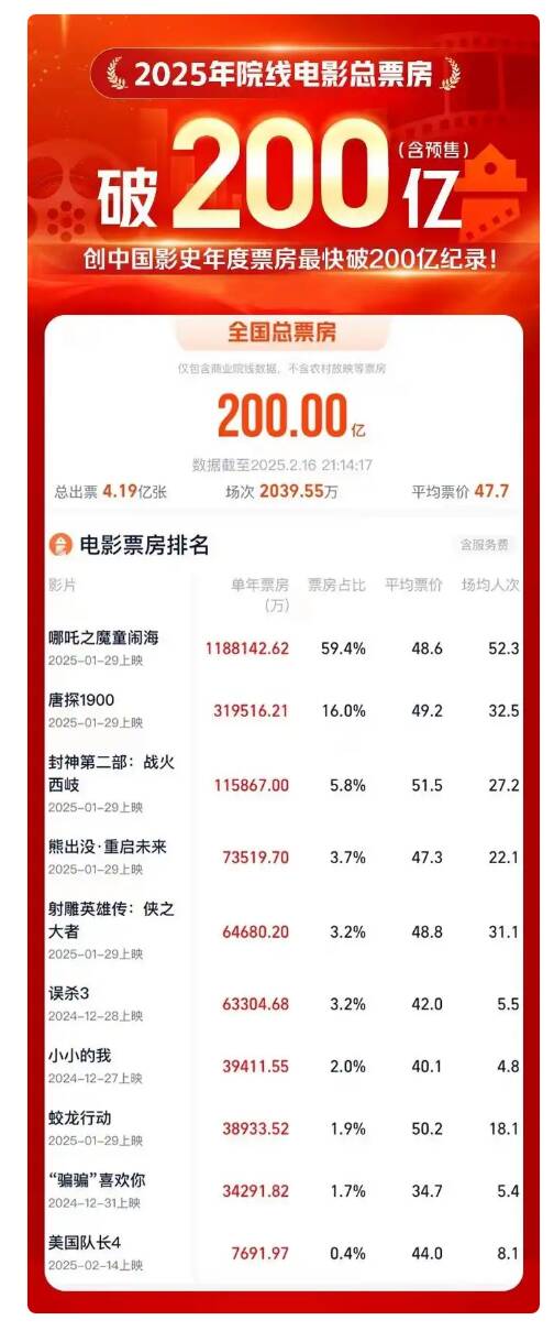 >>>据网络平台数据,16日21时14分,2025年度票房(含预售实时)破200亿元,刷新中国影史年度票房最快破200亿纪录。其中,《哪吒之魔童闹海》以59.4%的票房占比断层领跑。