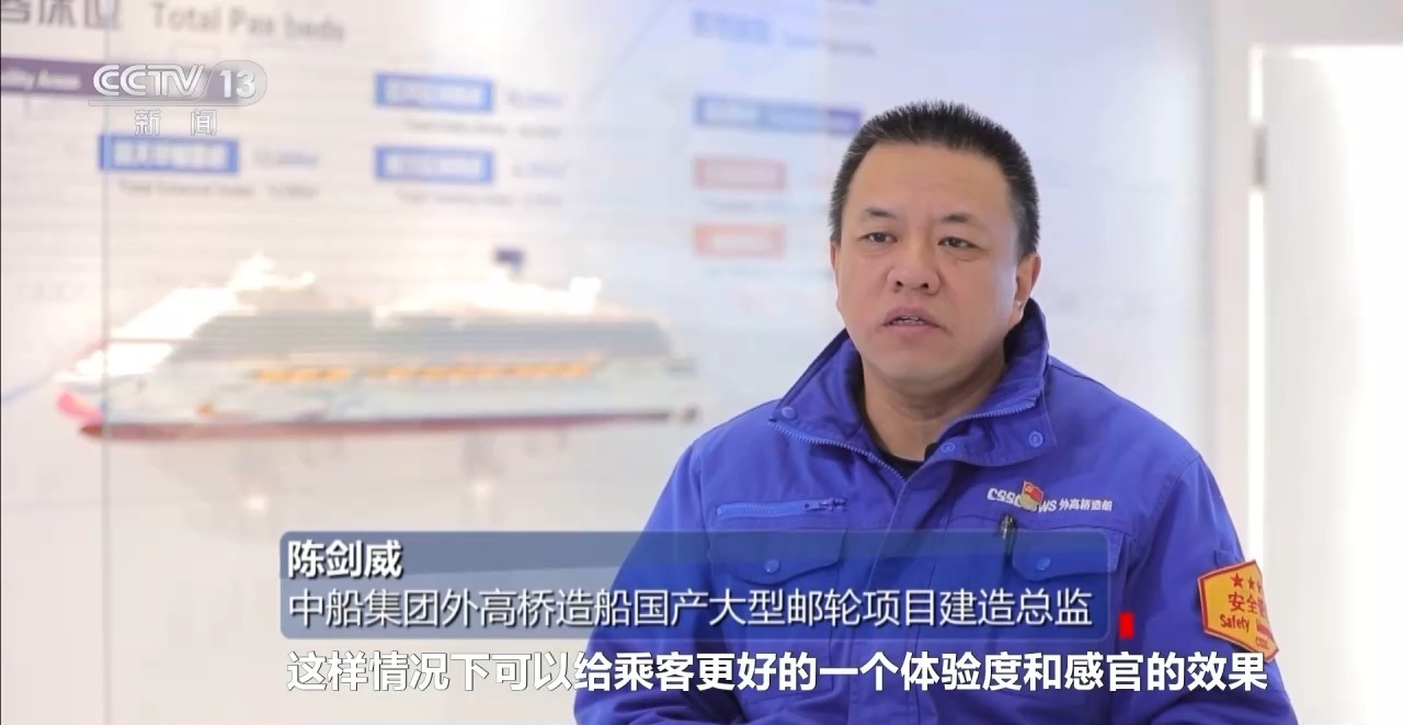中船集团外高桥造船国产大型邮轮项目建造总监 陈剑威:公区增加了很多,大约八千个平方米,可以给乘客更好的一个感官效果。为了控制重心,用了一些新材料,更加平稳的话,可能乘客晕船现象会比较少一点。