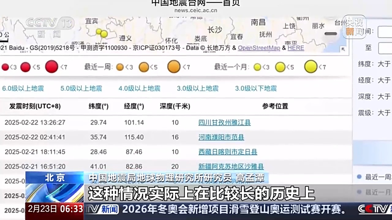 中国地震局地球物理研究所研究员 高孟潭:我们国家是一个地震多发的国家,实际上最近的一个月在我国境内发生过的有感地震有60多次,历史上还不算是地震频发的时段。