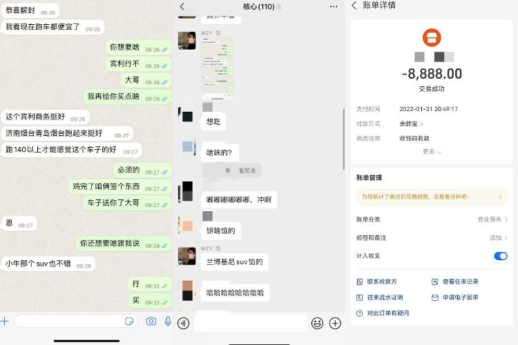值得注意的是,王政源关于股票的消息大多来自一个“大哥”,王政源称这个“大哥”是上市公司的内部人员。刘峰说,有一次,王政源说要给这位大哥送豪车,需要群友分摊,大家给王政源转账8888元,刘峰和徐一诺也转了。