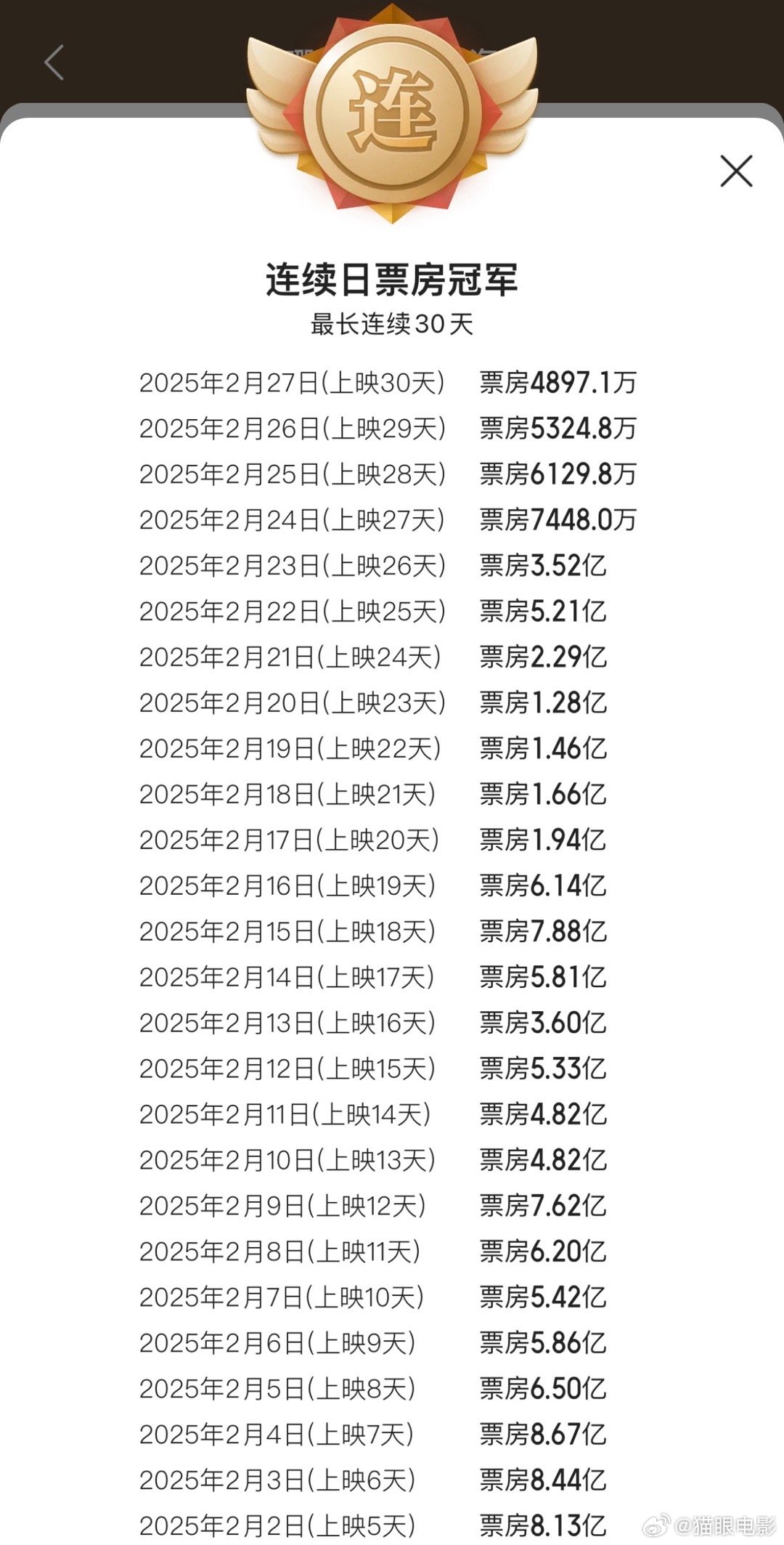 据猫眼专业版数据,截至2月27日,电影《哪吒之魔童闹海》上映30天,连续30天获得单日票房冠军!
