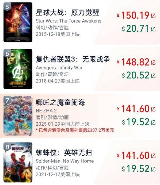 >>>据灯塔专业版全球票房榜显示,截至3月1日,影片《哪吒之魔童闹海》全球票房(含预售)突破141.60亿,超过《蜘蛛侠:英雄无归》进入全球影史票房榜前7名。