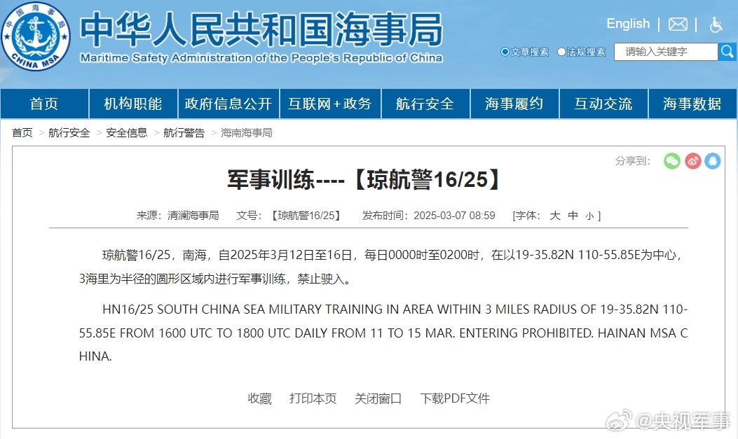 据中国海事局网站消息,清澜海事局发布航行警告,3月12日至16日,每日0时至2时,南海部分水域进行军事训练,禁止驶入。