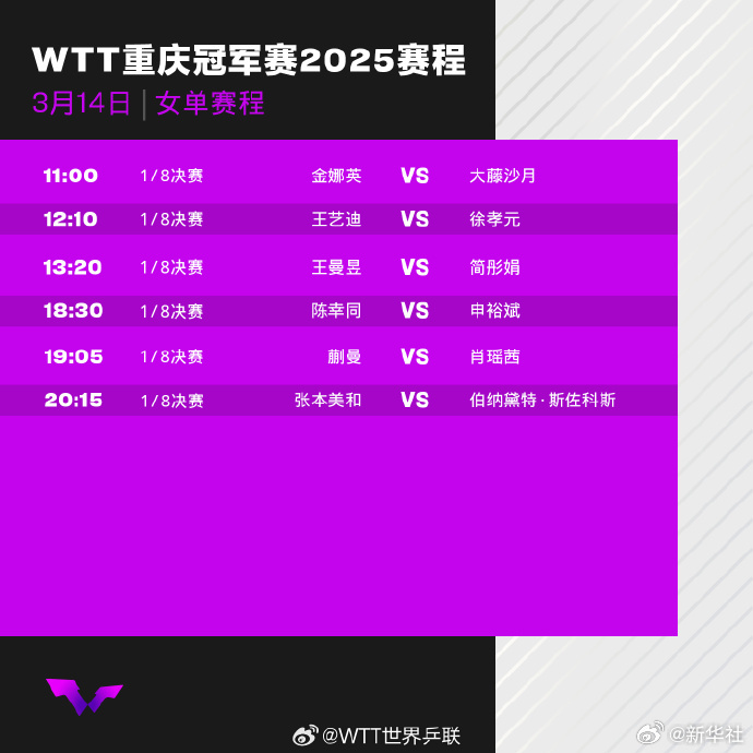 WTT重庆冠军赛2025今日继续进行。王楚钦、王曼昱 、林高远 、梁靖崑 、王艺迪 、陈幸同等国乒队员将出战单打1/8决赛。一起为国乒加油!