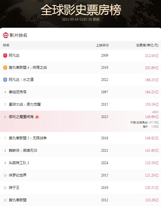 据网络平台数据,截至目前,电影《哪吒之魔童闹海》全球票房(含预售及海外)已超过149.69亿元,位居全球影史票房第6,距全球影史票房第5的《星球大战:原力觉醒》仅差0.5亿。