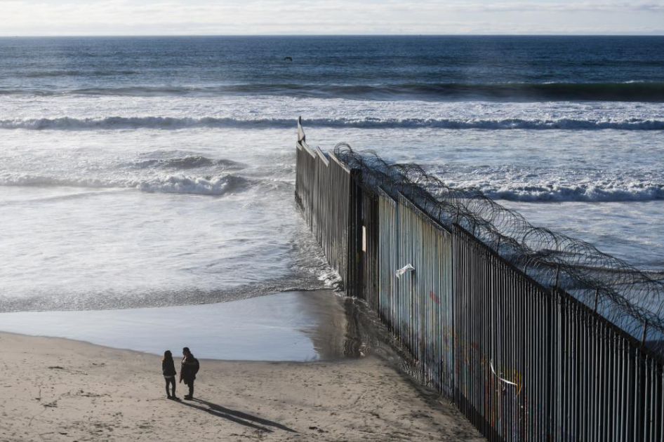 2019年1月10日,在墨西哥边境城市蒂华纳,游客在美墨边境墙边交谈。新华社记者辛悦卫摄