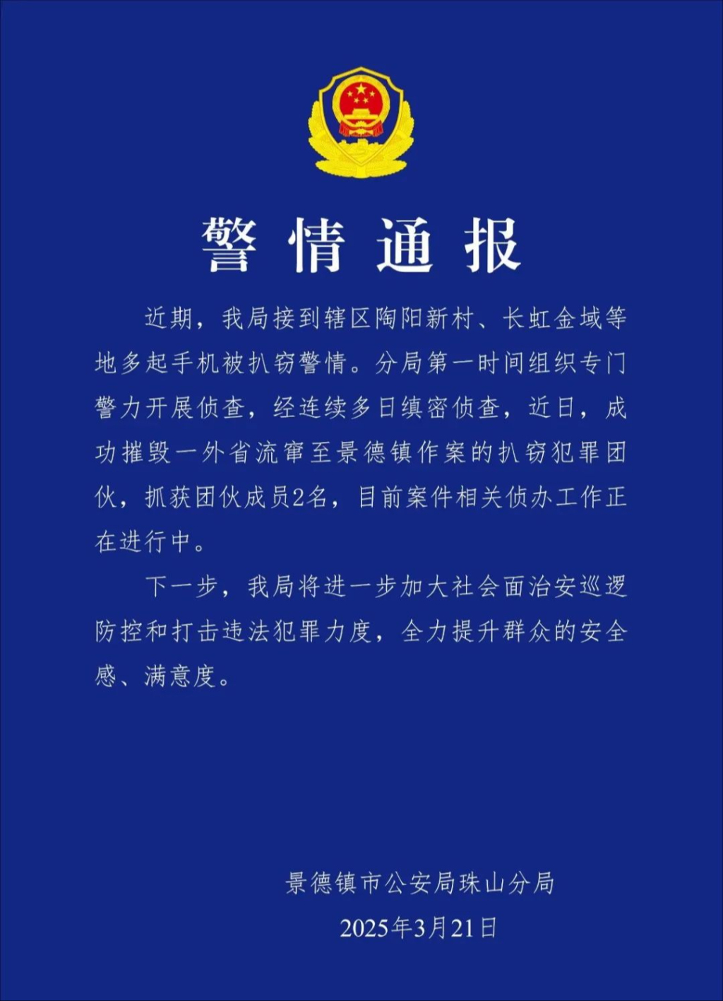 景德镇市公安局珠山分局3月21日中午发布警情通报:近期,该局接到辖区陶阳新村、长虹金域等地多起手机被扒窃警情。分局第一时间组织专门警力开展侦查,经连续多日缜密侦查,近日,成功摧毁一外省流窜至景德镇作案的扒窃犯罪团伙,抓获团伙成员2名,目前案件相关侦办工作正在进行中。下一步,该局将进一步加大社会面治安巡逻防控和打击违法犯罪力度,全力提升群众的安全感、满意度。