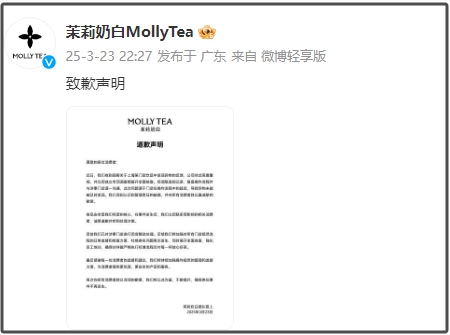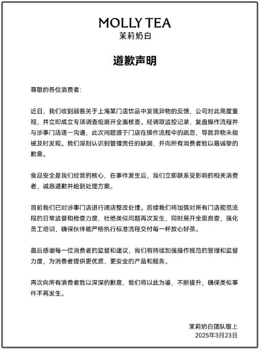 23日22时27分,茉莉奶白官方微博发布致歉声明,表示问题源于门店在操作流程中的疏忽,导致异物未能被及时发现。目前,涉事门店已闭店整改。