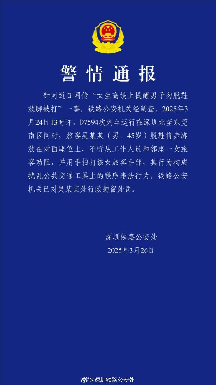 针对近日网传“女生高铁上提醒男子勿脱鞋放脚被打”一事,铁路公安机关经调查,2025年3月24日13时许,D7594次列车运行在深圳北至东莞南区间时,旅客吴某某(男,45岁)脱鞋将赤脚放在对面座位上,不听从工作人员和邻座一女旅客劝阻,并用手拍打该女旅客手部,其行为构成扰乱公共交通工具上的秩序违法行为,铁路公安机关已对吴某某处行政拘留处罚。