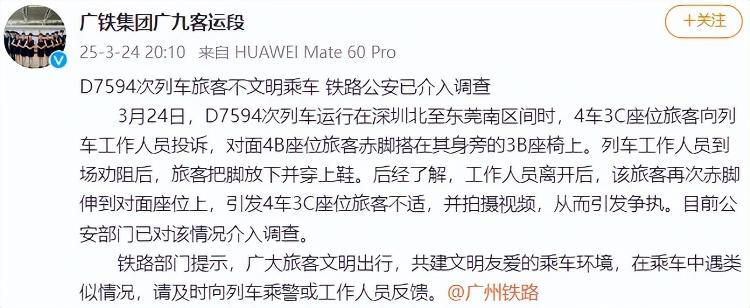 3月24日,D7594次列车运行在深圳北至东莞南区间时,4车3C座位旅客向列车工作人员投诉,对面4B座位旅客赤脚搭在其身旁的3B座椅上。列车工作人员到场劝阻后,旅客把脚放下并穿上鞋。后经了解,工作人员离开后,该旅客再次赤脚伸到对面座位上,引发4车3C座位旅客不适,并拍摄视频,从而引发争执。目前公安部门已对该情况介入调查。