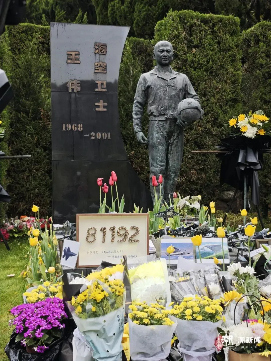 王伟烈士墓前满是战机模型和鲜花。 潮新闻 图