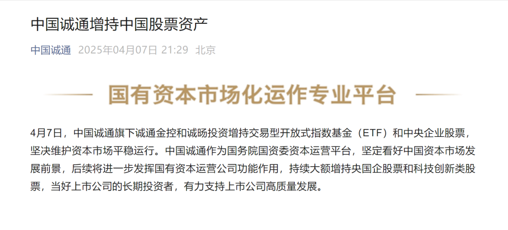 记者从中国诚通控股集团有限公司获悉,4月7日,中国诚通旗下诚通金控和诚旸投资增持交易型开放式指数基金(ETF)和中央企业股票,坚决维护资本市场平稳运行。中国诚通表示,作为国务院国资委资本运营平台,坚定看好中国资本市场发展前景,后续将进一步发挥国有资本运营公司功能作用,持续大额增持央国企股票和科技创新类股票,当好上市公司的长期投资者,有力支持上市公司高质量发展。(记者王希)