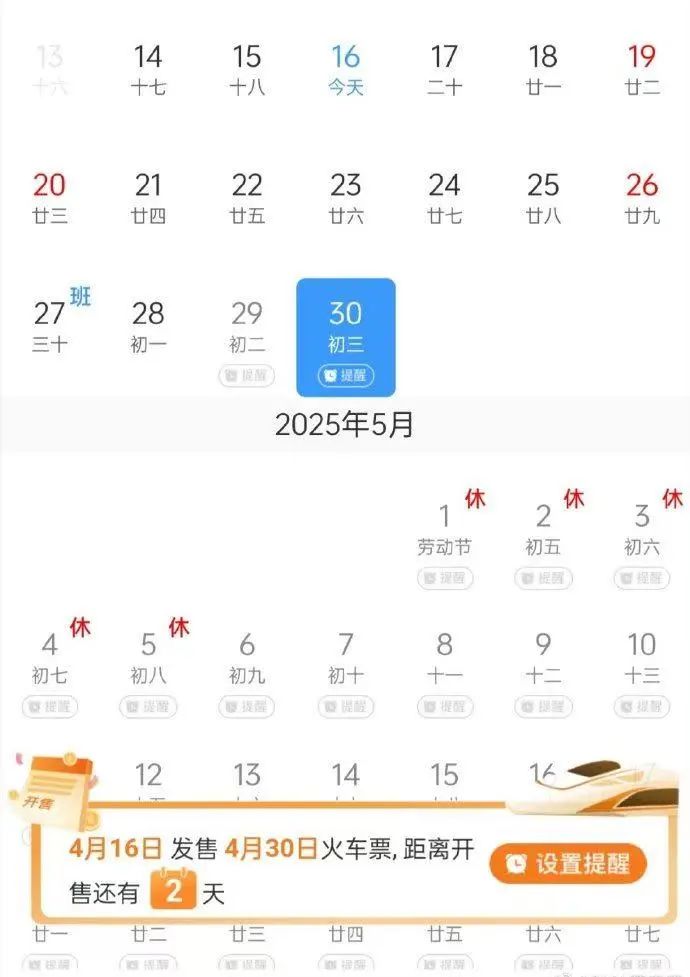据悉,今天,五一假期前一天(4月30日)的火车票正式发售。2025年五一小长假自5月1日至5月5日,共5天。根据目前铁路客票提前15天预售的规则类推,4月17日开售5月1日假期首日火车票;4月21日开售5月5日假期最后一天火车票。