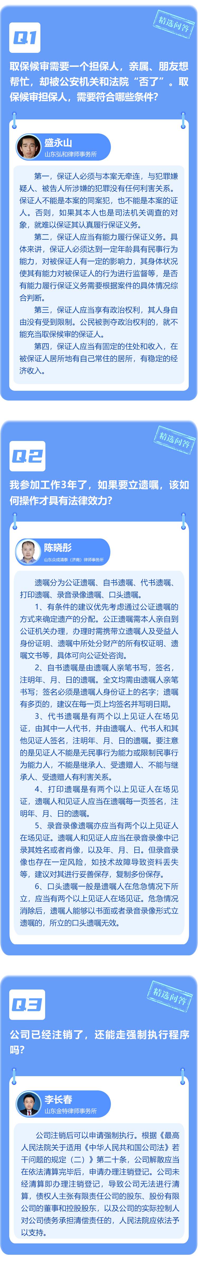 取保候审担保人需要符合哪些条件?公司注销了还能申请强制执行吗?如果要立遗嘱,该如何操作才具有法律效力?一起来看“闪电律师团”本周精选问答!