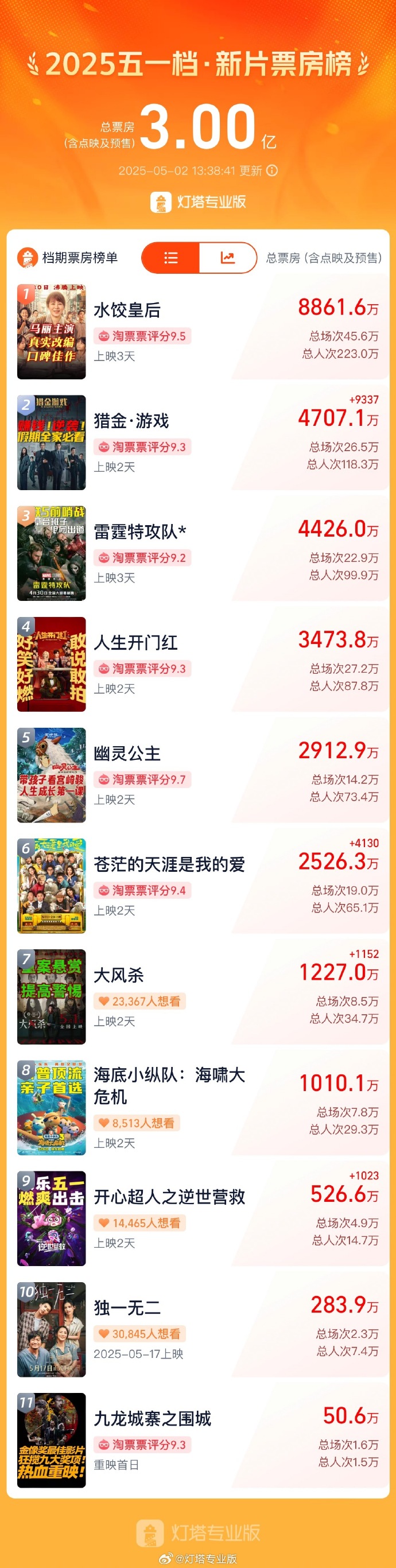 CYQY-生活与科技据灯塔专业版,截至5月2日13时38分,2025年五一档新片(含重映)总票房(含点映及预售)突破3亿,影片《水饺皇后》《猎金·游戏》《雷霆特攻队*》《人生开门红》《幽灵公主》《苍茫的天涯是我的爱》暂列前六。