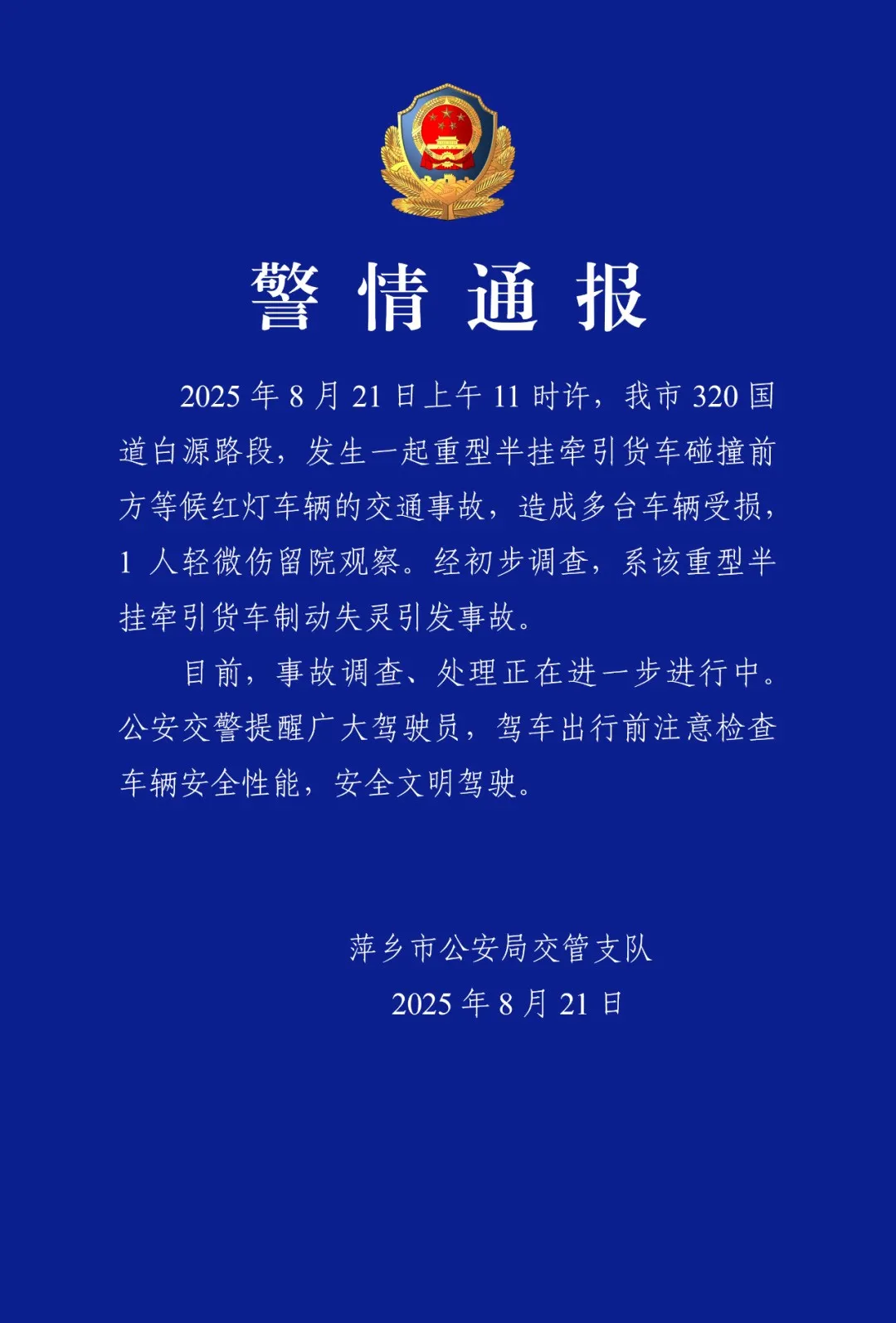 江西萍乡警方:一货车制动失灵致多车受损,1人轻微伤留院观察