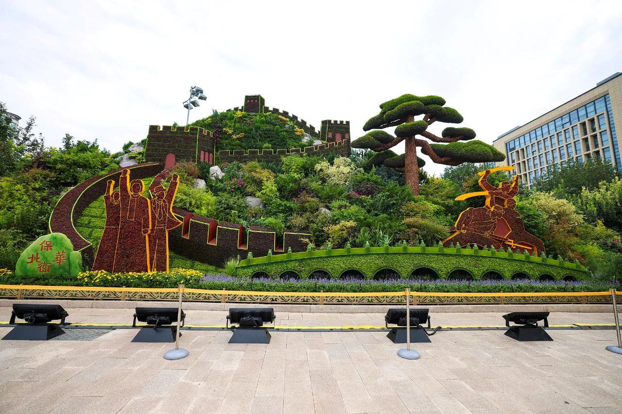 位于东单路口西南角的主题花坛,精美还原了北京卢沟桥等诸多华北地区的抗战故事。