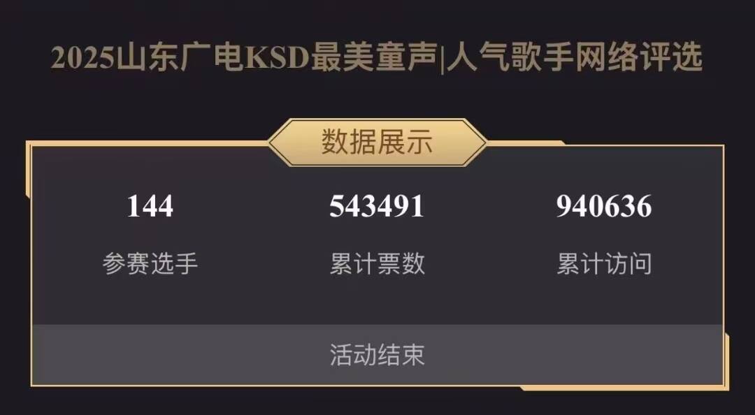 决赛期间,面向进入《2025山东广电KSD最美童声全球青少年歌手大赛》决赛的选手开展网络歌手评选活动,依托其公益属性与参与互动性,获得了社会各界的广泛关注与踊跃参与。为期五天的线上投票环节,活动累计实现94万次访问量,收获54万张有效投票,整体参与情况充分体现出山东广电KSD品牌赛事的广泛影响力。