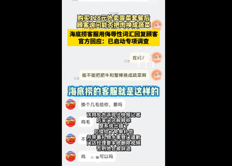 8月24日,内蒙古呼和浩特一名网友发视频称,自己通过外卖平台在当地一海底捞门店下单后,在咨询客服时,收到对方含有侮辱性词汇的回复。从当事人发布的聊天记录里可以看到,对方先是回复了“换个鸡毛给你”,然后紧接着又用谐音的形式说出了一句侮辱性词汇。