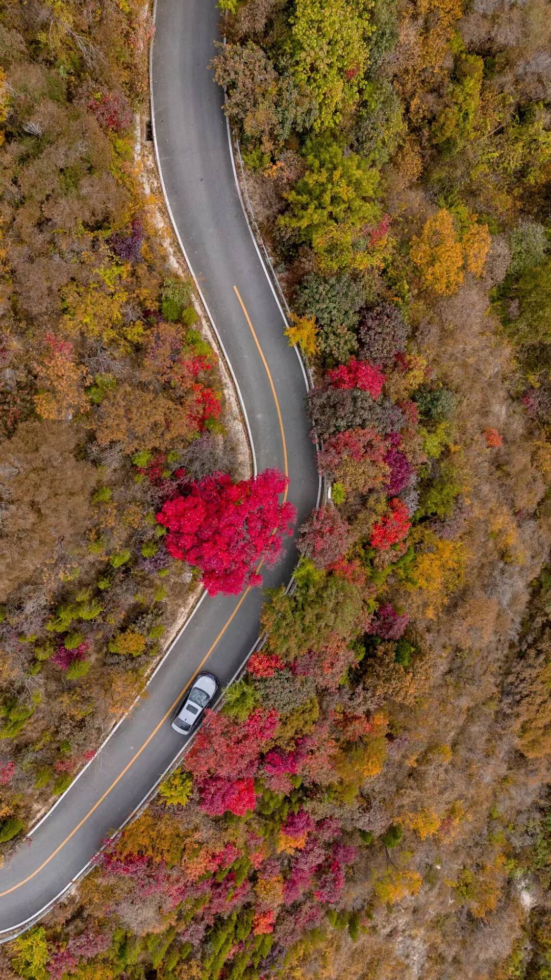 脚下深邃的山谷不再是纯粹的险峻,而是披上了大自然奢侈的调色盘,像一块巨大的暖色地毯,于群山间铺展开来。