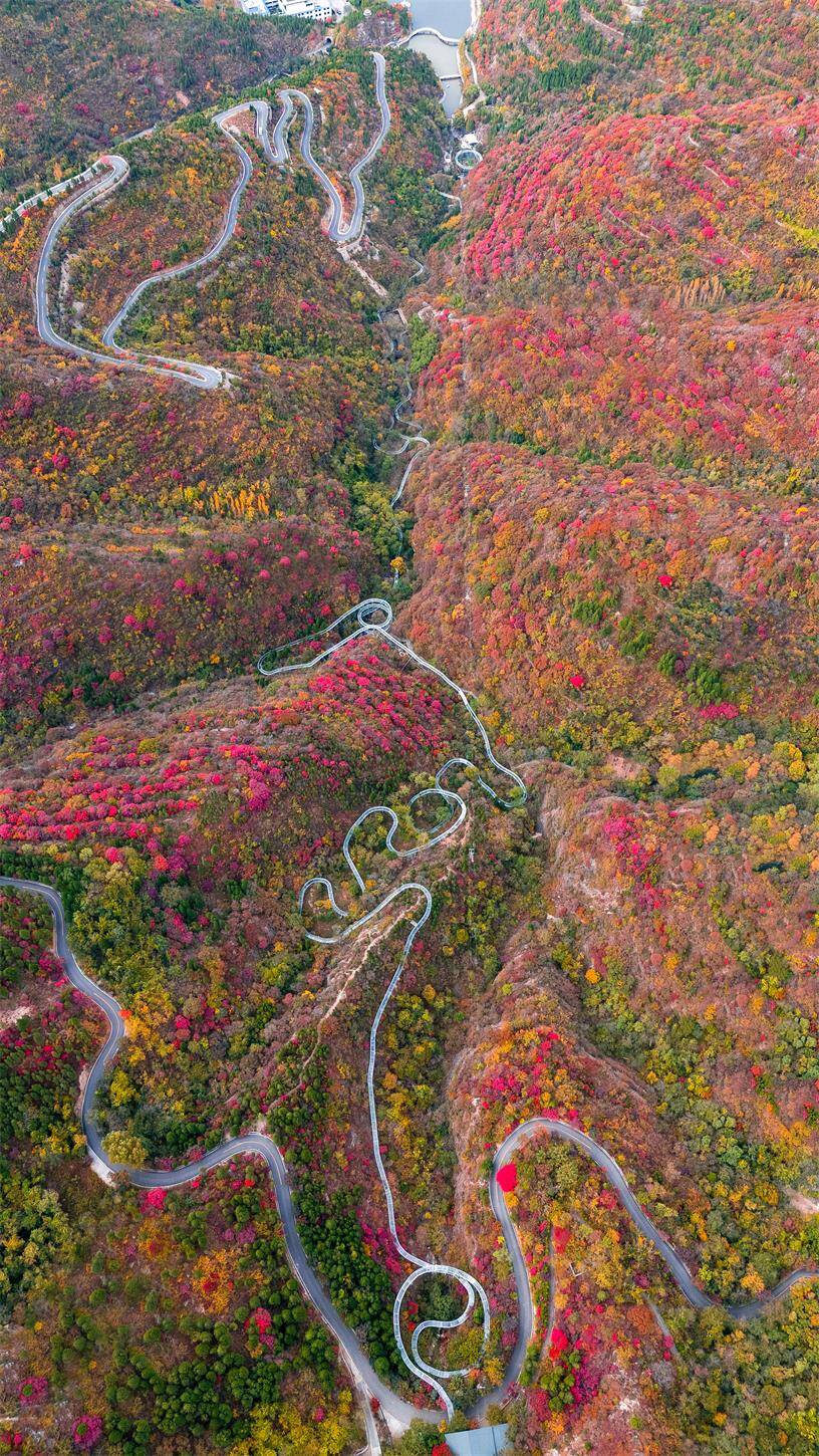 走过九龙潭,湖光山色,秋韵浓浓,在蓝天青山环绕下的湖水清澈透底,湖面波光潋滟,山色空濛,分不清是人间还是仙境。