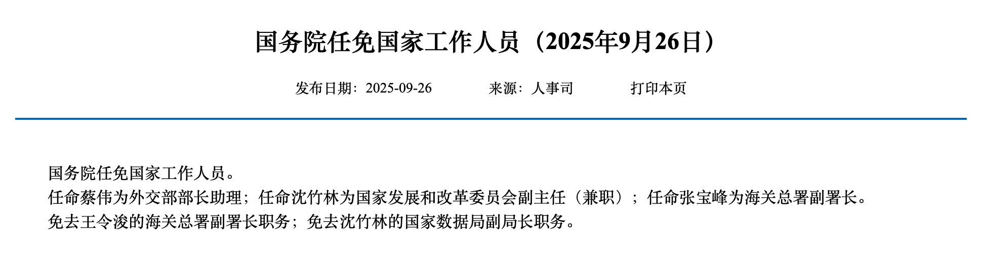免去王令浚的海关总署副署长职务;免去沈竹林的国家数据局副局长职务。