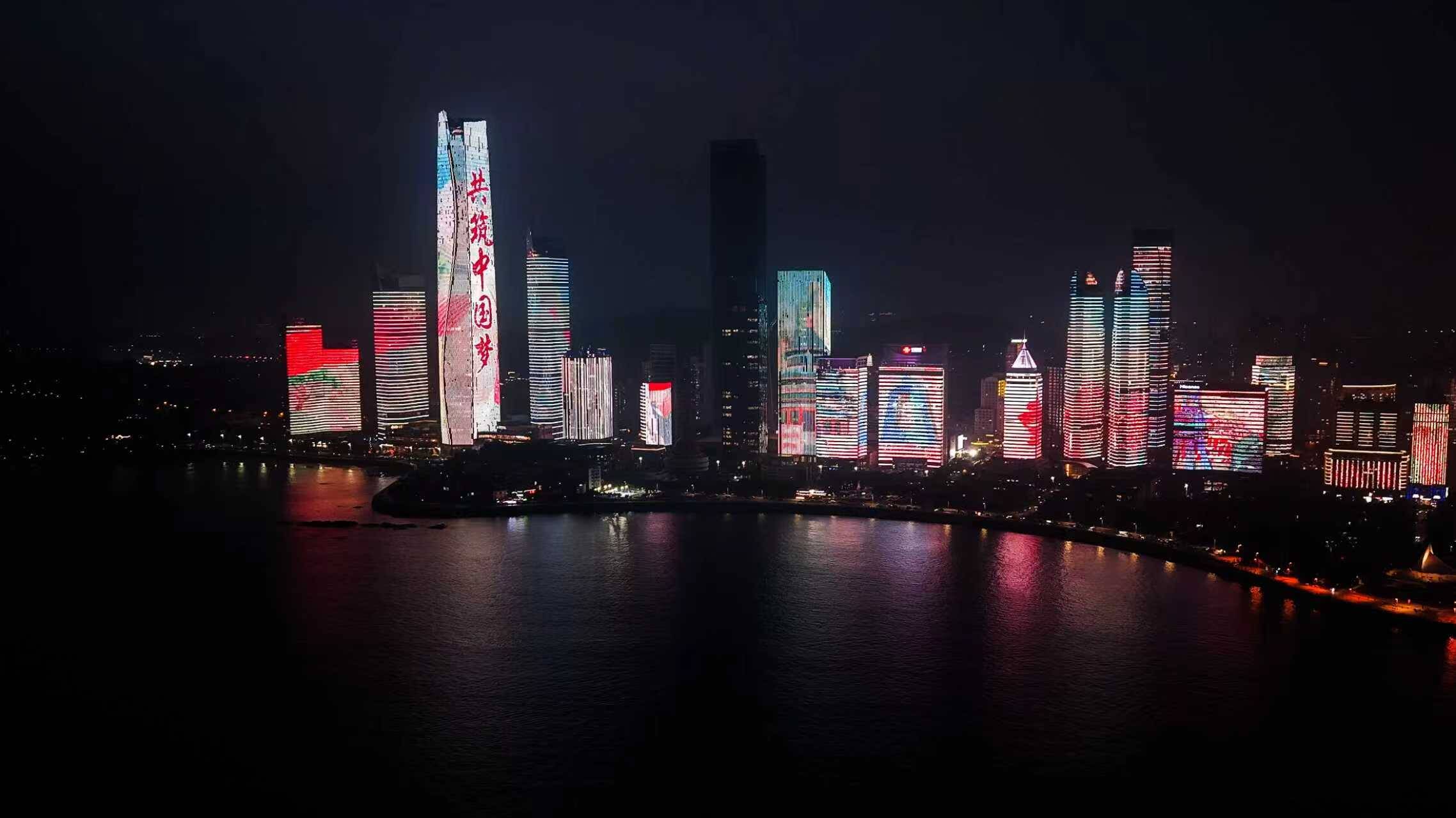 “大美中国”主题灯光秀分四个篇章,以绿水青山为底色,伴随红绸丝带飘动,一幕幕展现祖国的发展成就,传递大美中国的家国情怀。